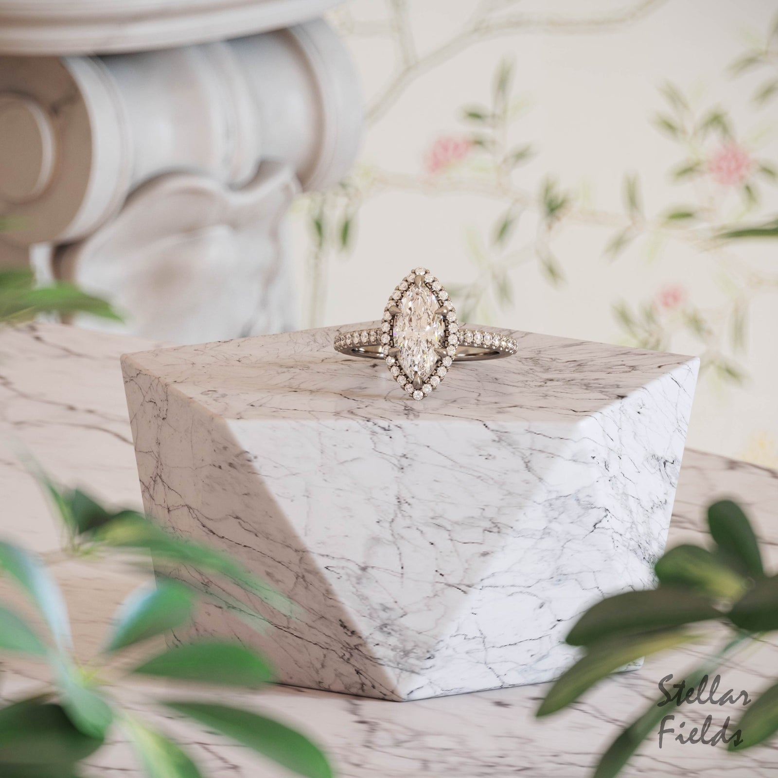from $2,200.00 USDMarquise Diamond Halo Engagement Ring Scalloped Micro Pave Band