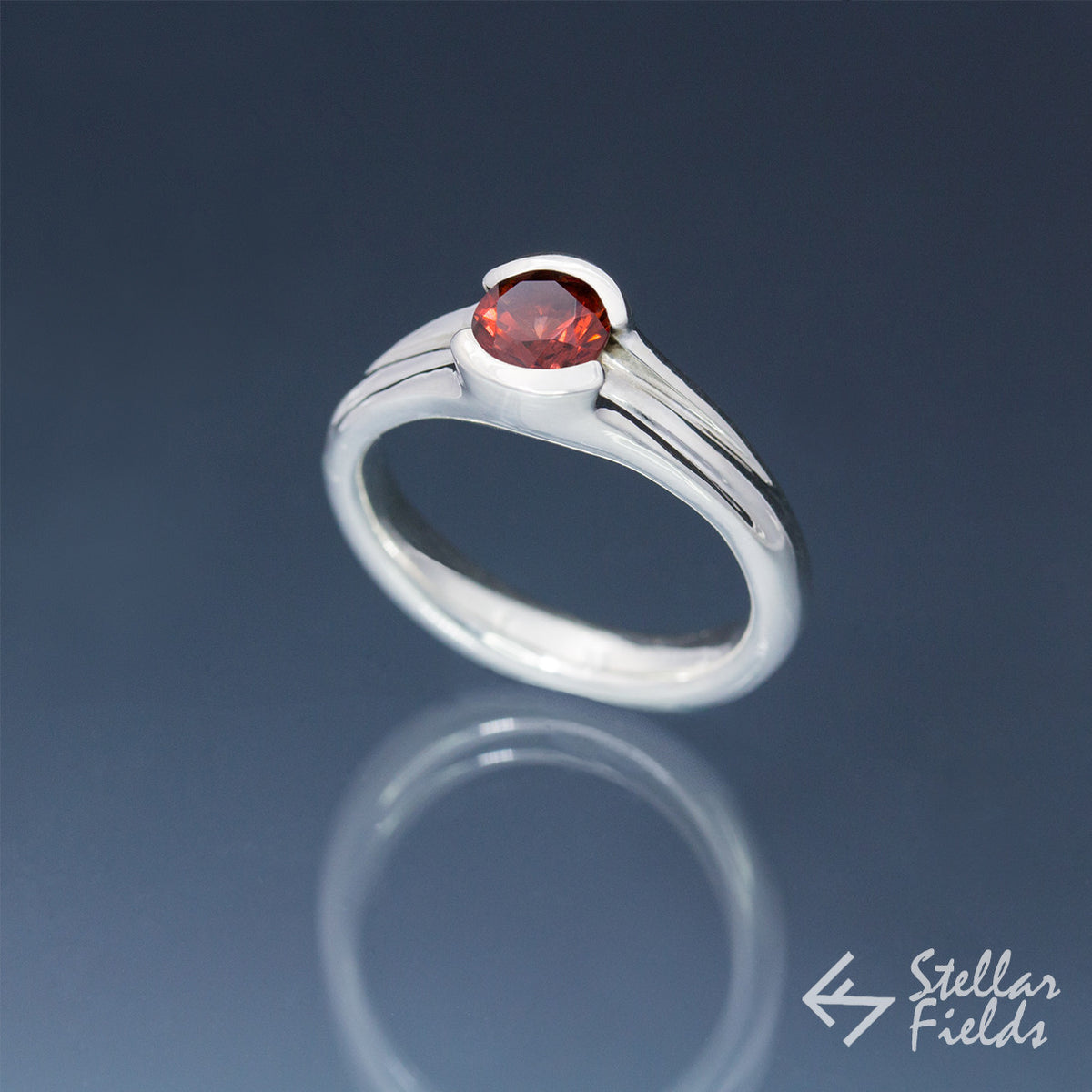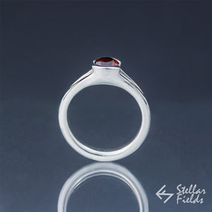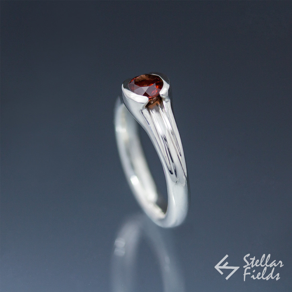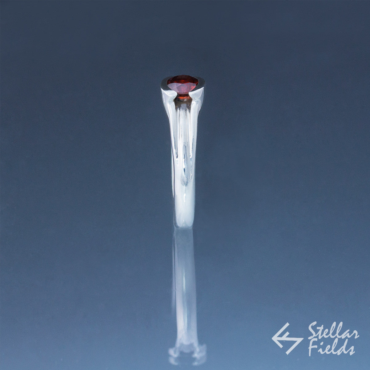 This charming ring is minimal yet contemporary and unique in design.  A 'Fair Trade' 5mm red garnet sits cradled in a modern, part tension and part semi-bezel, hybrid setting.  The stone’s seat is open on two sides to reveal more of the stone and to maximize light entering the stone for greater sparkle and shine.  The ring’s band and stone seat merge seamlessly into each other to maintain a clean and modern look.  The unique ring band also transforms from a traditional plain band to one with three ripples along its surface on the upper half of the ring.  Minimal and eccentric in details, this ring is comfortable to wear and delights from from every angle.
