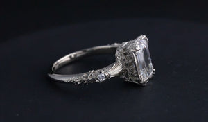 This ring is our princess cut version of our round stone 'Elise' heirloom ring, customized with accent stones on both sides of the band for that extra sparkle.